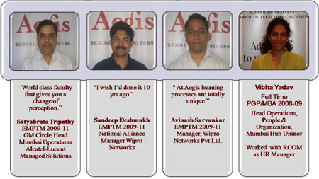 h) Placement and Live consulting assignments & internship:�Some of the top firms that have employed Aegis alumni are: The Clinton Foundation, Ernst & Young, Bharti - Airtel, Tata Communications, Tata Indicom, Reliance Communications, Vodafone, Idea, VSNL, GTL, Nortel, Ericsson, Nokia, Cisco, Siemens, Leadcap Ventures, Lucent, Avaya, Org Telecom, ZTE, Huawei,� Nokia Siemens Networks, TCS, Wipro, Orange,� HCL, etc.�